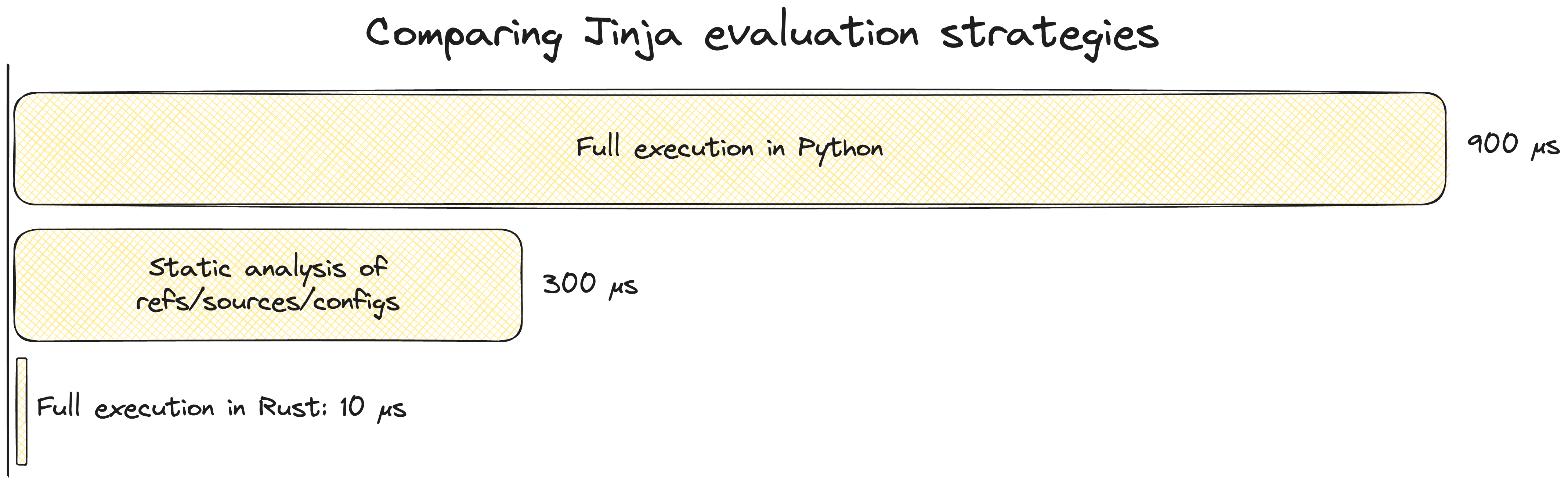 This is not the post for a deep dive on why Rust and Python have such different performance characteristics, but the key takeaway is that minijinja can fully evaluate a ref 30 times faster than today's dbt can even statically analyze it.